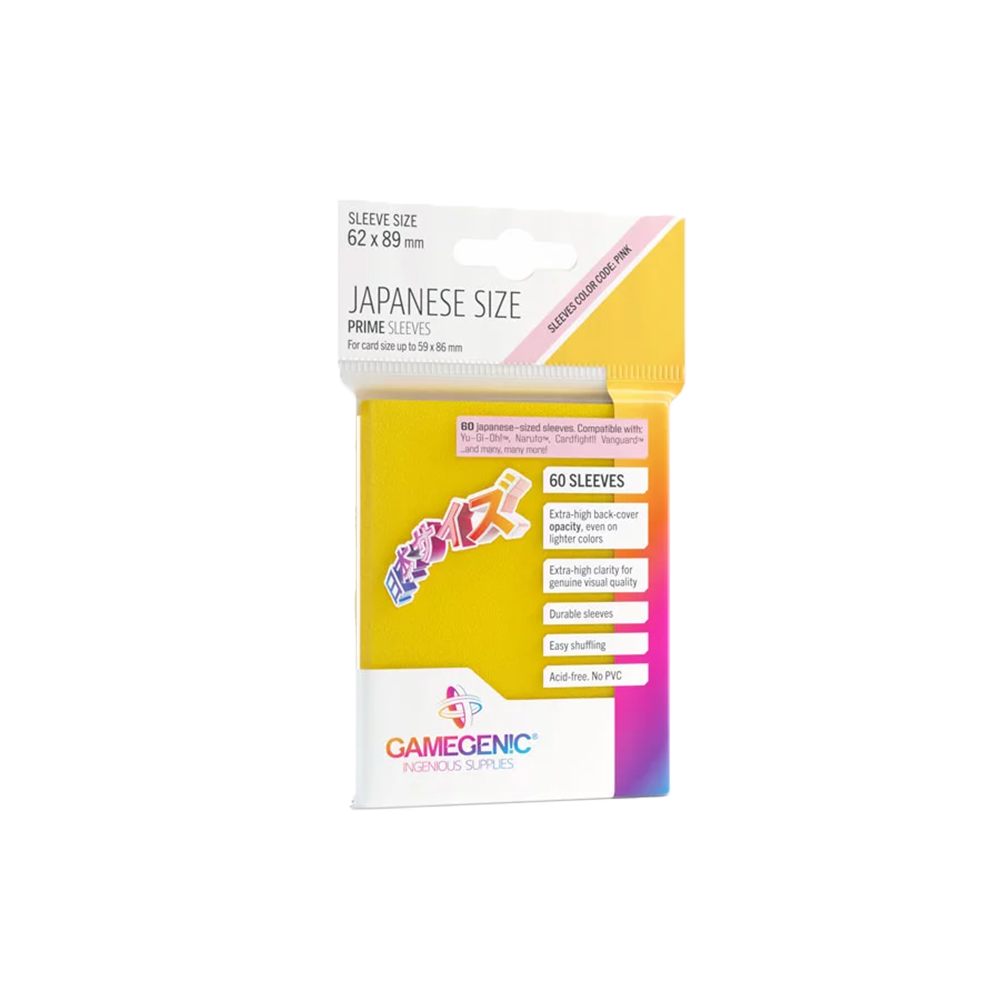 Store your Japanese-sized cards securely with the Gamegenic Prime Sleeves in Yellow. This pack includes 60 high-quality sleeves, providing robust protection and a smooth shuffle feel. The yellow design adds a vibrant touch to your collection.