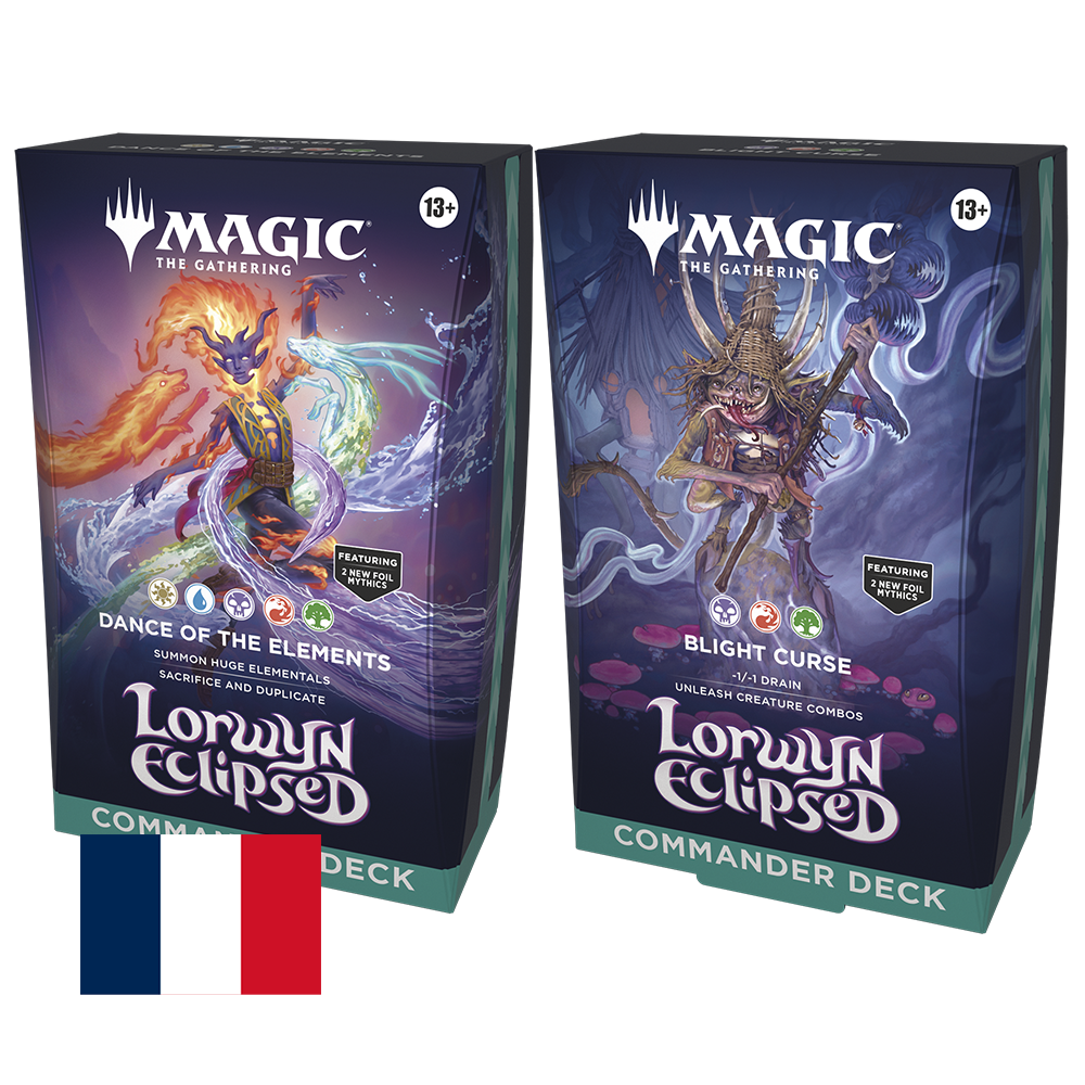 RETURN TO THE LAND OF LIGHT AND SHADOW Lorwyn returns, not as it once was, but a world split in two. Explore this dual-aspect plane filled with enchanting creatures and embrace the powers of order and chaos. COMMANDER DECKS Pick up and play Magic’s most popular multiplayer format; get two preconstructed decks that embody the duality of light and shadow with legendary commanders tied to Lorwyn or Shadowmoor. CONTENTS 2 Lorwyn Eclipsed Commander Decks (1 Dance of the Elements + 1 Blight Curse deck)