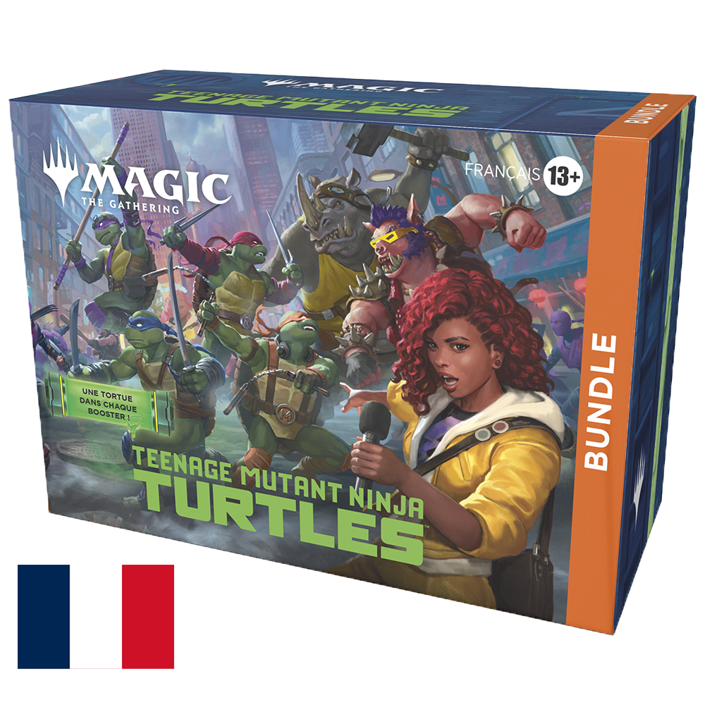 This Bundle contains 9 Magic: The Gathering | Teenage Mutant Ninja Turtles Play Boosters, plus 1 Traditional Foil card with Bundle-exclusive alternate-art, 15 Traditional Foil (5 Full-Art) and 15 nonfoil Land cards (5 Full-Art), 1 oversized Spindown life counter, 1 card storage box, and 2 reference cards. Each Play Booster contains 14 Magic: The Gathering cards, including 1–5 cards of rarity Rare or higher and at least 1 Traditional Foil card.