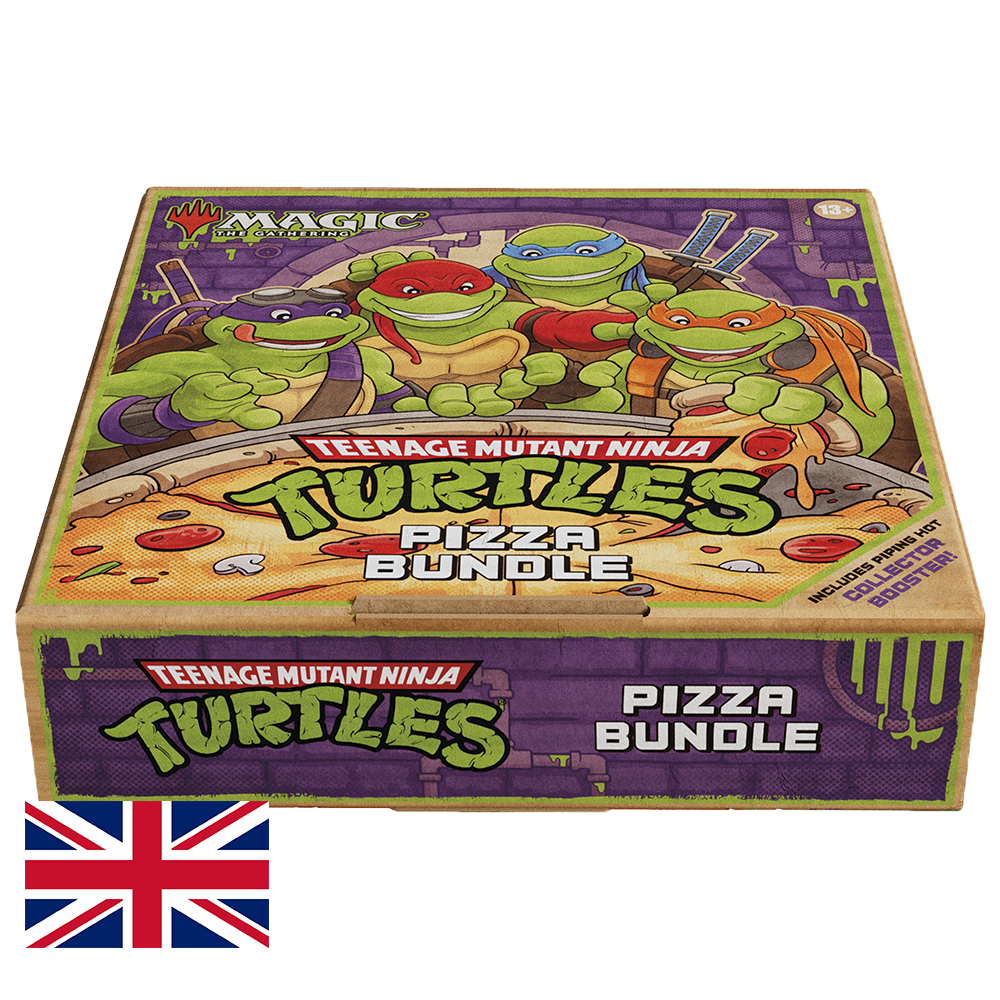 This Pizza Bundle includes nine 14-card Magic: The Gathering | Teenage Mutant Ninja Turtles Play Boosters, one 15-card Magic: The Gathering | Teenage Mutant Ninja Turtles Collector Booster, 2 of 6 Promo Cards, 5 Traditional Foil Full-Art basic lands, 25 regular Full-Art basic lands, and a special oversized Pizza Bundle Spindown life counter.